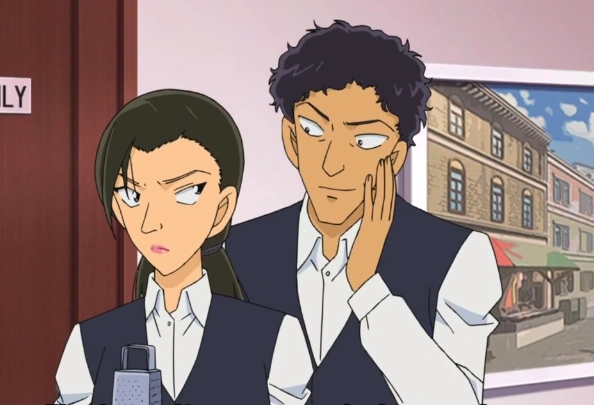 Este se dirige hacia la misma camarera que atendió a Conan, Isuzu Naomura, pidiéndole que se casase con él ya que la actual jefa se retiraría al casarse y podría obtener dinero. Esta se niega por lo que Saraie se queja de que ha cambiado su peinado por algo y le dice que la protegerá. Esto hace temblar a Naomura.