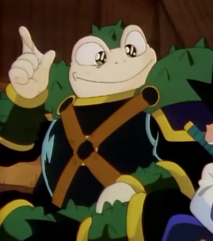 Es una rana gigante muy particular; puede hablar, camina como una persona, tiene ojos grandes y lleva puesto una armadura.