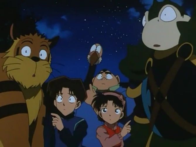 Luego Kaito Kid cae del cielo sobre él (después de chocar con Shonosuke).