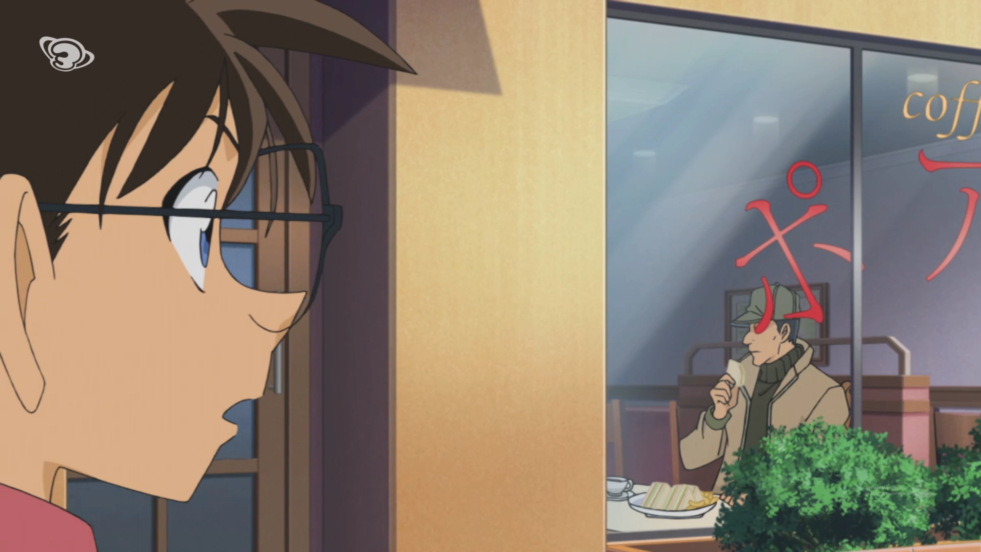 Kogoro, Ran y Conan desayunan en el Café Poirot cuando ven a un hombre sospechoso observando a Tooru Amuro.